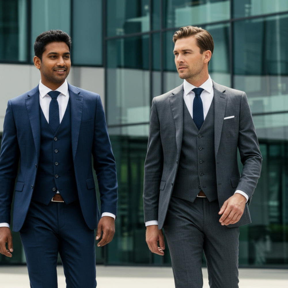 At The Travelling Tailor, the 3-piece suit represents the pinnacle of bespoke sophistication — a seamless blend of tradition, craftsmanship, and modern refinement. This timeless ensemble includes a jacket, waistcoat, and trousers, each meticulously tailored to create a balanced, distinguished silhouette that embodies elegance and authority.