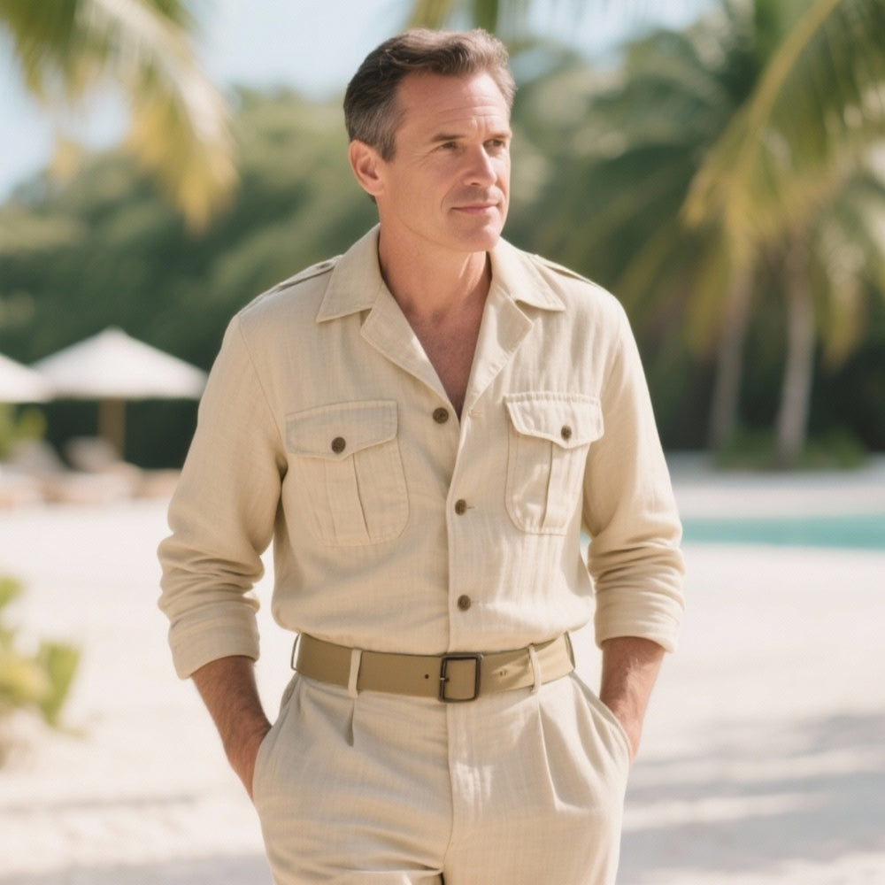 The Safari Suit by The Travelling Tailor is a sophisticated blend of classic utility and contemporary elegance, designed for the modern gentleman who values both style and comfort. Inspired by traditional safari attire, this suit is characterized by its lightweight, breathable fabrics, structured yet relaxed fit, and functional design elements such as multiple patch pockets, belted waists, and buttoned flaps, combining practicality with refined tailoring.