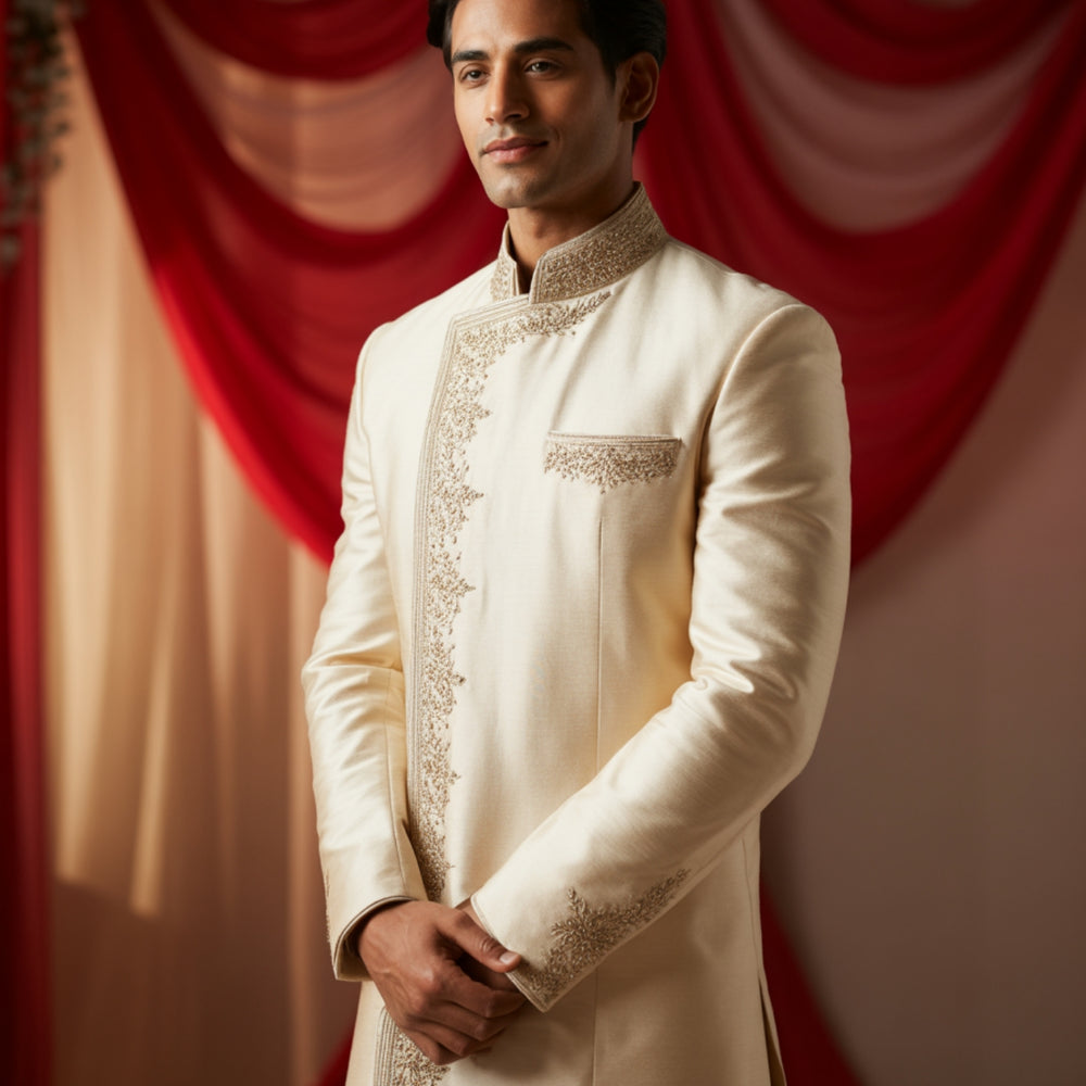 Paired with churidars, dhotis, or straight-cut trousers, and complemented by accessories such as a stole, turban, or mojari shoes, the Sherwani becomes a complete statement of grandeur and grace. It embodies the essence of bespoke tailoring on the move, offering heritage craftsmanship delivered with precision, personalization, and convenience.
